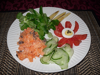 Germans make some of the most beautiful salads I have ever seen. You will most likely find the carrot salad in a proper German salad, along with a variety of other things. Often you'll find egg, potato salad and a mound of dilled cucumber in German salads. I used to make carrot salad like a New England girl. I'd throw in mayo, dash of vinegar, salt and pepper and some raisins.